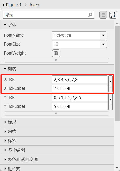 而XTickLabel的意思是在XTick位置显示的数据是多少,比方说2对应的XTickLabel是2.5,那么在横坐标上长度等于2的位置就会显示2.5,我们来实验验证一下