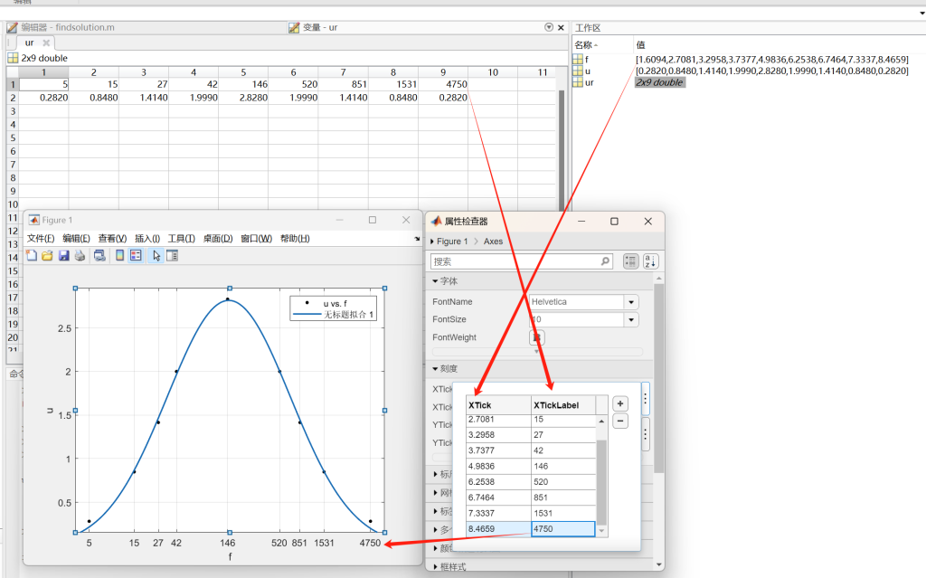 可以看到坐标真的发生变化了,根据这个思路,我们只需要将XTick改成上面进行log处理后的f,XtickLabel改成没有log处理过的f就可以了(注意XTick必须是递增序列,修改的时候要注意)