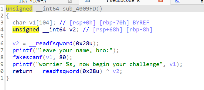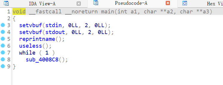 main函数很简单,首先在reprintname函数里会输入name,接着把他打印出来,调试可发现利用字符串输出到\x00才截止可以泄露出__IO_stdout的地址,从而泄露libc基地址