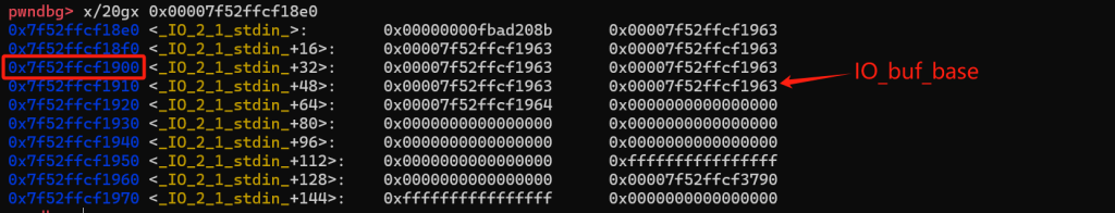 它的地址很特殊,以963结尾,而特殊之处就在于地址900正好在他的上方不远处,根据结构体我们可以知道它对应的是IO_write_base(本题中不重要),也就是说,如果我们让这个任意写漏洞写在IO_buf_base的位置,那么下一次输入缓冲区就变成了900开始的位置,而这个位置经过一定的输入构造,恰好可以覆盖IO_buf_base的值为mallochook的地址,那么在下一次输入的时候,就是往mallochook里输入了。
