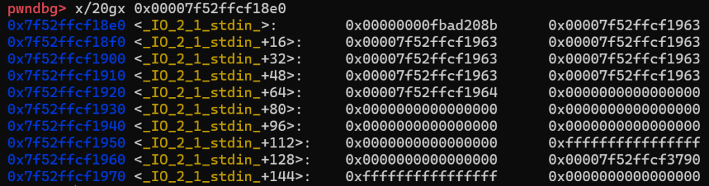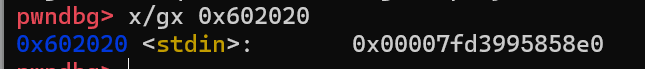 首先打开ida我们可以发现stdin存放于0x602020处(bss段)查看该地址,可以发现存放的还是一个地址