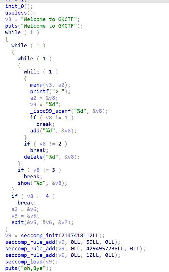 比较经典的菜单题,循环结束会开沙箱,禁用system,不过本题思路一仍然可以在循环内getshell,此沙箱可以暂时忽略,1、2、3、4分别对应增删改查,5是退出,不过我的打法仍然没有用到edit功能
