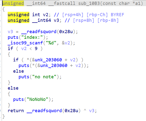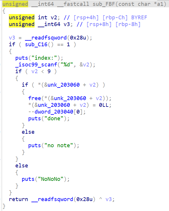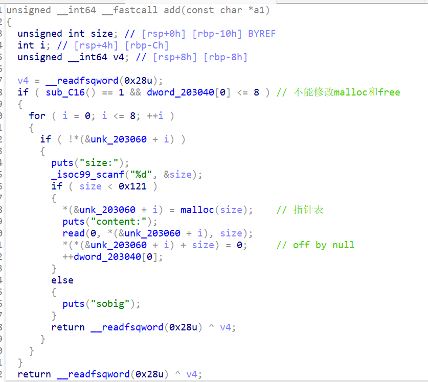 sub_c16函数限制了此题不能修改mallochook和freehook。主体部分存在明显的off by null漏洞,可以借此实现堆块合并操作。结合循环条件可知,堆块下标从零计算,最多可以放9个(下标为8)