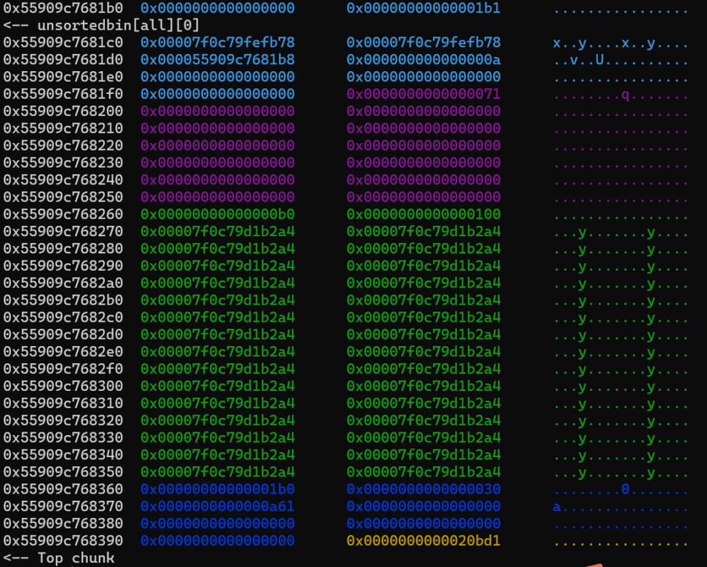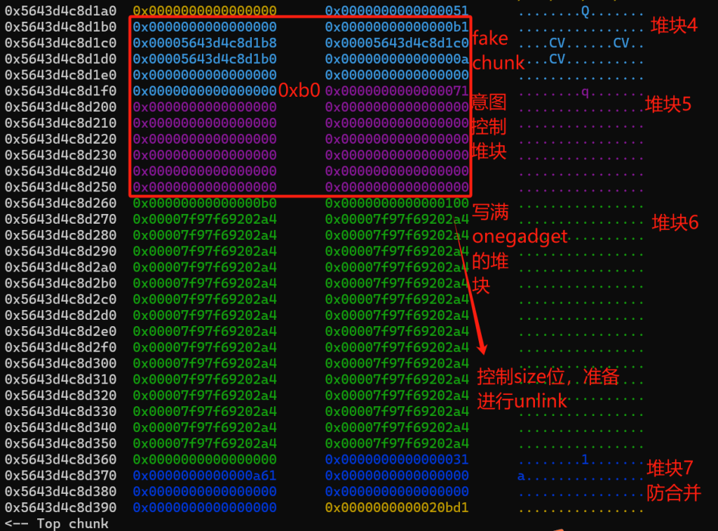 这是删除堆块6之前的堆块构成,可以看到,经过堆块5的先释放后重新申请,成功实现了将下一个堆块的size位改写为00(因为有off by null漏洞)所以选择0xf0大小的堆块原因就在这里,他的size位原本刚好是0x101,如果小于0xf0,那他的size位只有两位,经过off by null之后就无意义了。