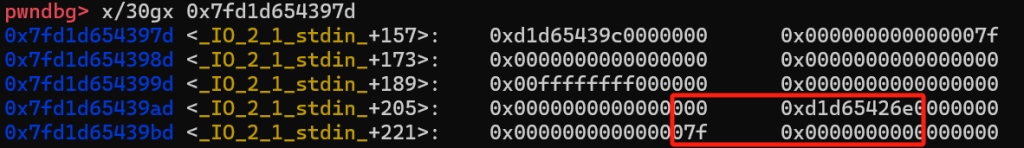 0x7f90e20d29a5 <_IO_2_1_stdin_+197>: 0x0000000000000000 0x0000000000000000
