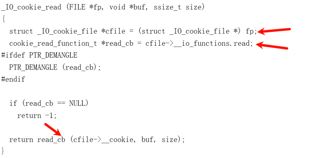 接着看到箭头2指向的代码,找到cfile->__io_functions.read并赋值给read_cb,而cfile->__io_functions.read不就是箭头指向的位置吗?也就是说,如果我能够伪造一个_IO_cookie_file,在__io_functions.read里放上我自己想要跳转的函数或者gadget,不就可以实现调用了吗?