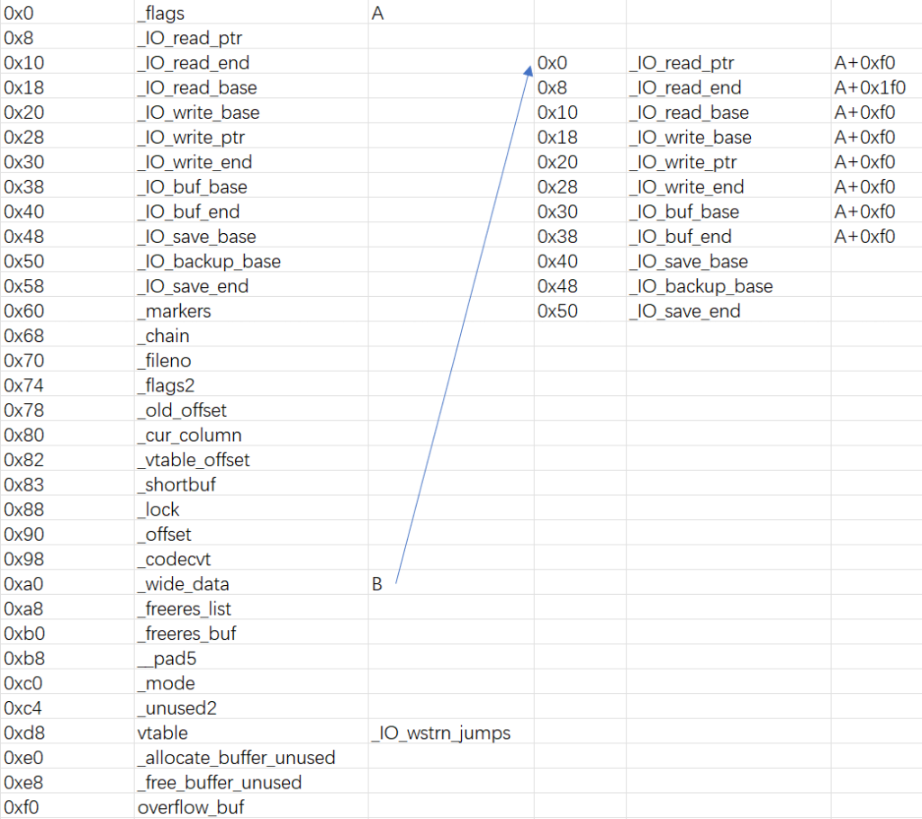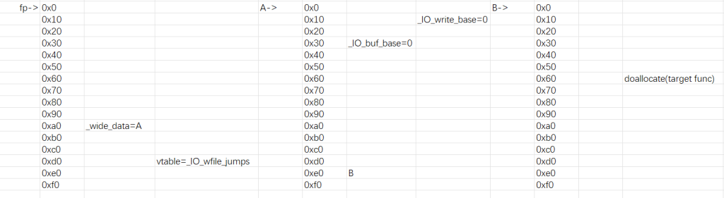 4._wide_data->_IO_buf_base设置为0,即满足(A + 0x30) = 0 _wide_data->_wide_vtable设置为可控堆地址B,即满足(A + 0xe0) = B