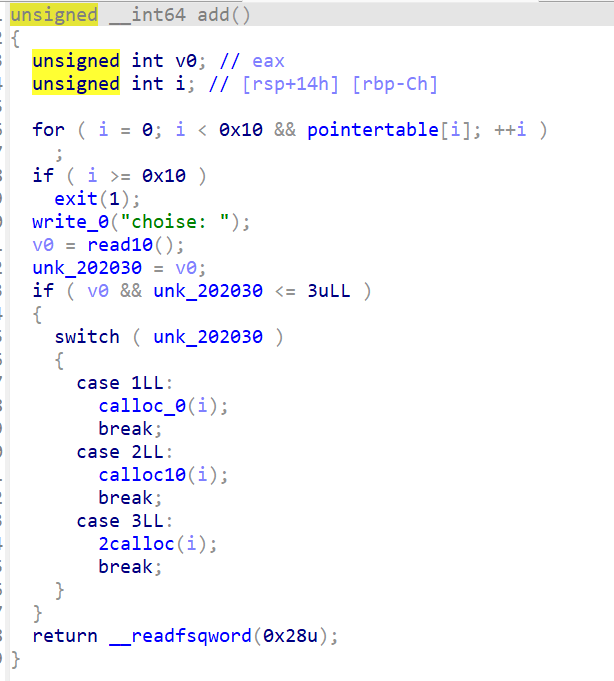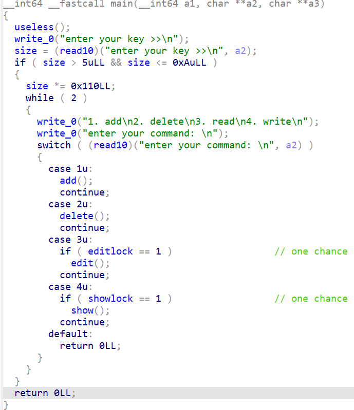首先输入一个key,key*0x110记为size,存到bss段上,add时只能选择三种大小,即size,size+0x10,2*size,分别对应选择1,2,3