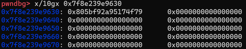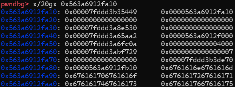 可以看到程序确实按照预期执行到了magic gadget(这里重新开了一遍gdb,所以堆地址变了),这段magic gadget确实很神奇,首先看一看这个地址往下的一块都存的什么值