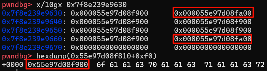 确实满足我们的推测,修改后的值也确实就是heapaddr+0xf0或heapaddr+0x1f0