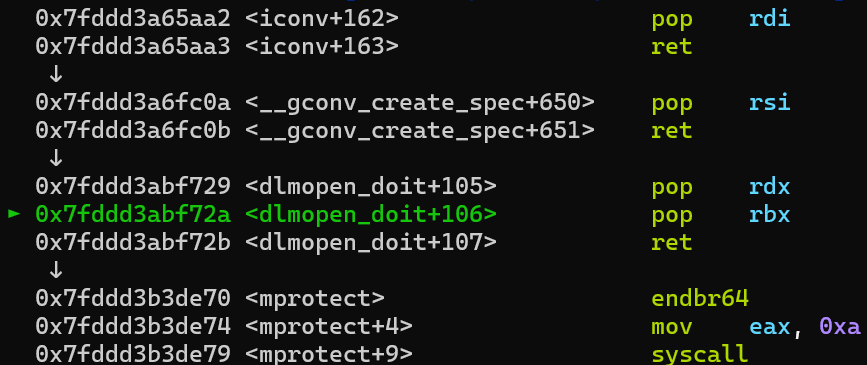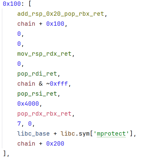 之后就是调用预先准备好的ROP链,设置参数并调用mprotect更改堆权限(其实这里直接打ROP链进行orw就可以了,这里显得有些多此一举)