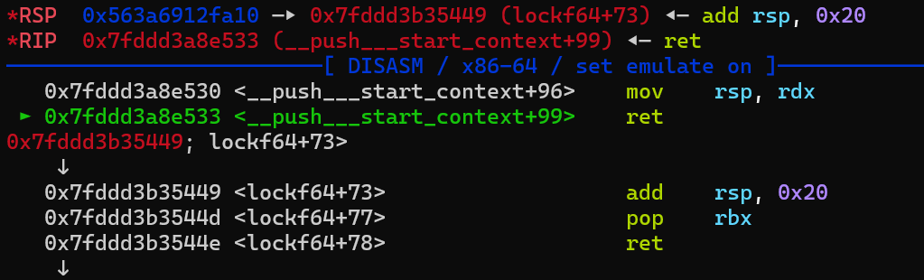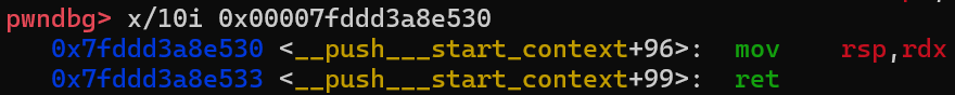 所以call的时候call的实际是a30的位置,也就是mov rsp,rdx,实际上是一个栈迁移的效果,可以看到执行后rsp指向了原先rdx的位置(堆地址),又由于接下来有2个ret,一个pop和一个add rsp,0x20,故rsp一共会增加0x38,即指向0x563a6912fa48,这里存放的是pop rdi,ret。