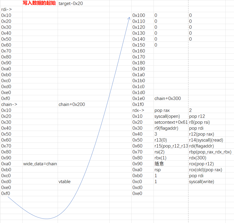 3._wide_data设置为可控堆地址A,即满足(fp + 0xa0) = A _wide_data->_IO_write_base设置为0,即满足(A + 0x18) = 0