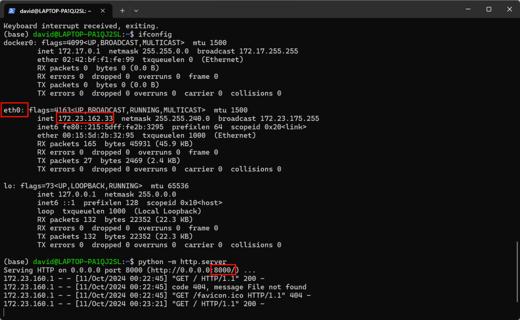 在wsl里启用一个虚拟服务,打开的是8000端口,我们来看一下我们的ip,此时是172.23.162.33