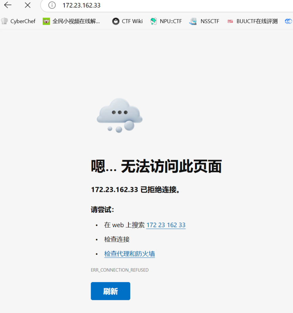 如果访问的是localhost(127.0.0.1),那么访问的是主机的localhost,并不是wsl里的localhost,也就是说,我的访问请求压根不会访问到wsl里的服务,因此,想要直接访问wsl的服务,我们需要直接访问wsl的ip:127.23.162.33