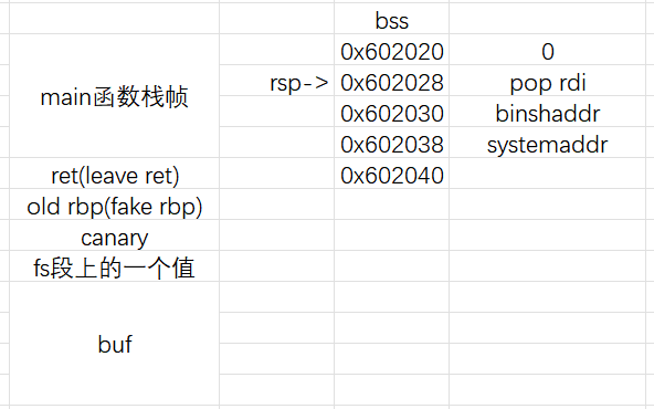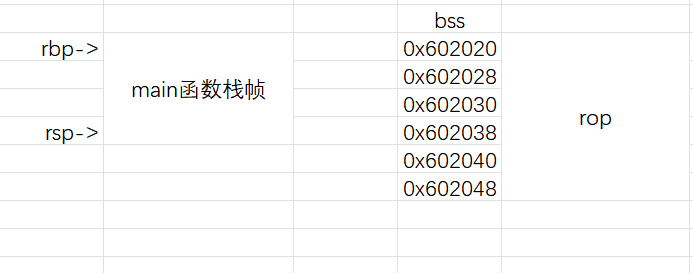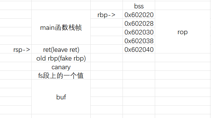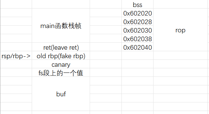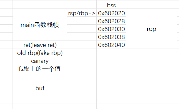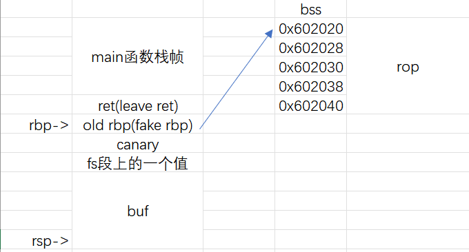 我们利用栈溢出,把原先的old rbp伪造成了fake rbp(0x602020),返回地址伪造成了leave ret的地址(注意,栈帧我画的是上面是高地址,下面是低地址,而bss上面是低地址,下面是高地址)