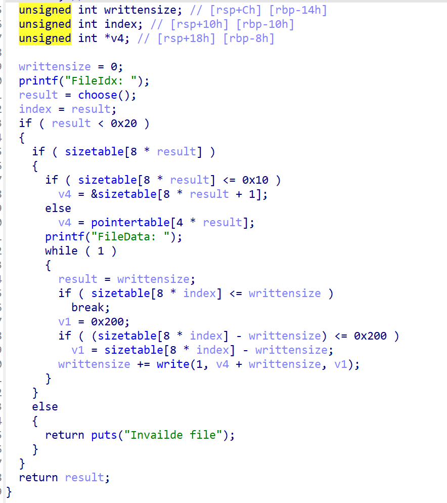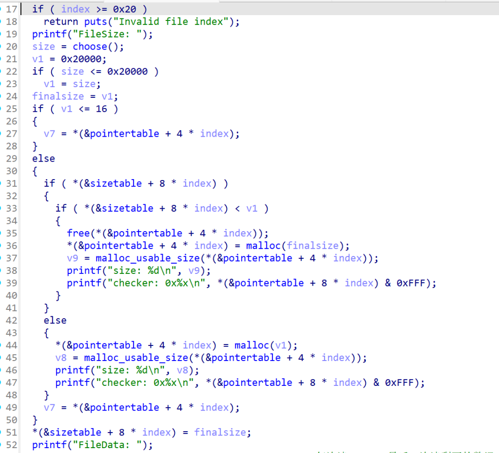 这里要输入一个index和一个size,并且size不能超过0x20000,如果超过,最后的size也是0x20000,不过这题不关心这里