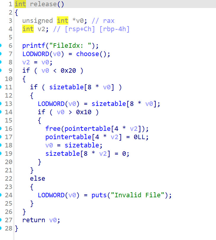 在size>16时,如果本身size表里已经有了,那么判断输入的size是否比size表里的大,是的话会将原先的堆块释放掉,再重新申请一块更大的,放到指针表里,下面的printf经过heshi的提点,猜测这个其实是给checker看的,不是做题需要的,事实也确实如此