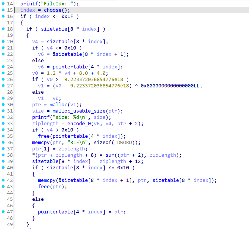 逻辑是这样,根据输入的index找sizetable,然后根据size的大小走不同的分支,如果size<=0x10,那么此时需要encode的数据存在bss上,也就是先前说到的结构体里的buf,反之在堆块上,取的是指针表里的指针,接着v0的计算大概就是预分配一个大一点的堆块,保证空间充足不会溢出,不必太关心,接下来讨论的都是size>0x10的情况