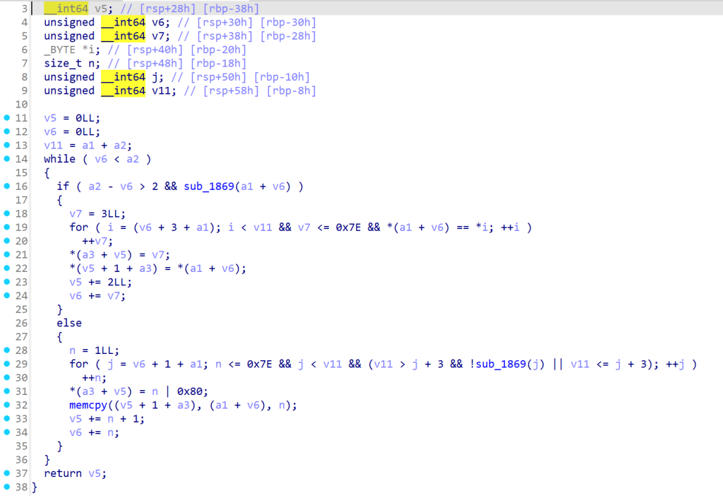 三个参数分别对应原数据的地址,原数据的大小,encode之后的数据的存放位置,返回值是encode之后的数据长度,那encode_0干了什么事呢?实际上就是对数据的压缩,这里举个例子说明,如果原数据是“aaaa”(\x61\x61\x61\x61),那么压缩完之后数据就是\x04\x61