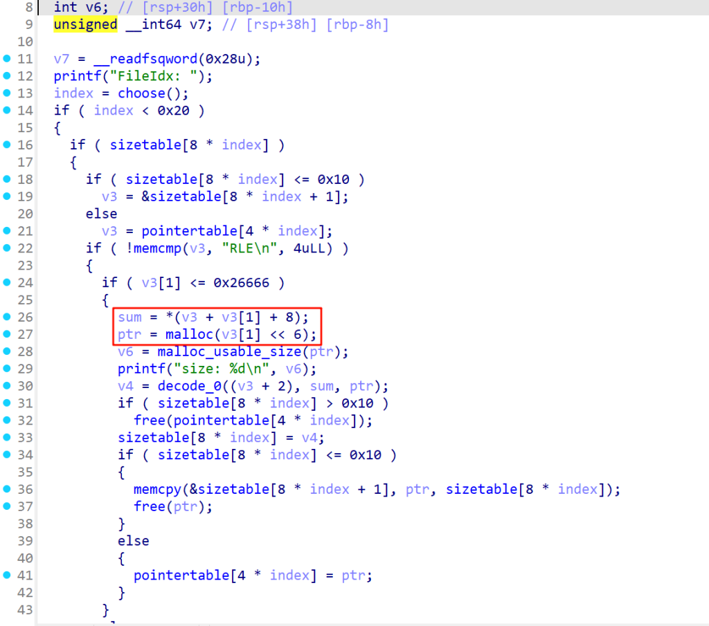首先程序会分析这个堆块的头是不是RLE\n,是的话会取一个sum,这个sum的位置是v3+v3[1]+8,那么v3[1]是什么呢?结合对encode函数的逆向分析可知,这里其实就是encode之后的数据长度,所以这里的sum就是伪造数据的ASCII码之和,所以如果我把这个sum伪造了,那么我就可以在decode的时候解压出更多的数据,从而覆盖下一个堆块的size