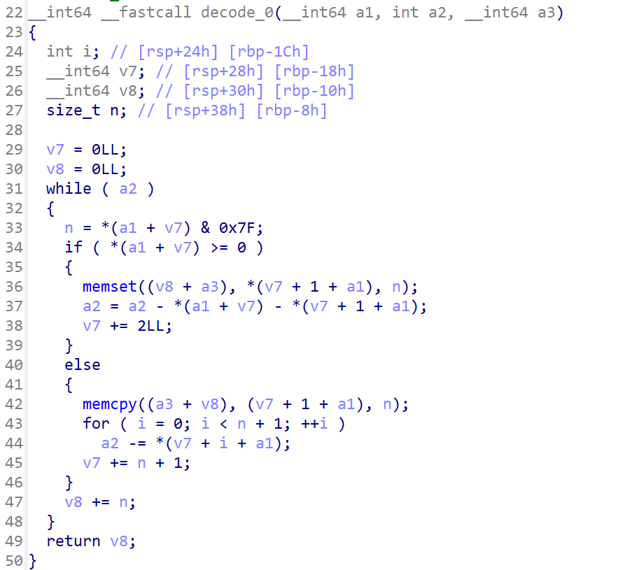 decode函数就是encode函数的逆过程,其中sum参数会做减法,减去每次解压的ASCII码,比如压缩后的数据是\x04\x61,如果我伪造的sum是0x67,那么在执行操作之后做减法,sum=0x67-0x4-0x61=0x2,那么我还可以继续写,他的判断是while(sum),也就是sum只有为0才会停止,为正为负都不会停止,这也会导致这样一个问题,如果sum变成了负数,那么就会死循环了,正因为sum必须为0才停止,所以这里的伪造比较复杂,需要不断调试