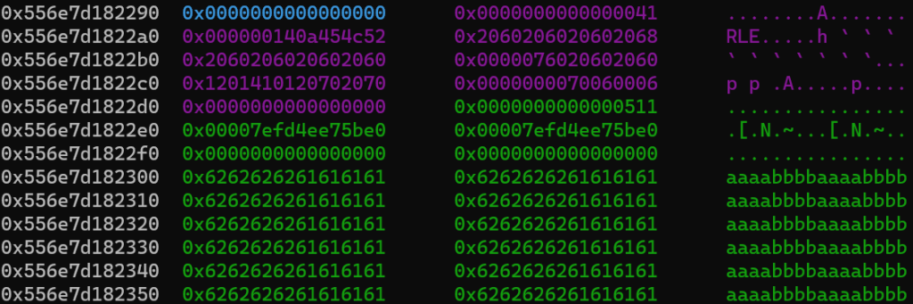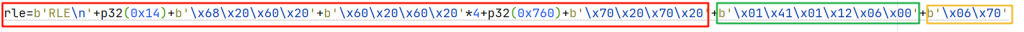 rle=b'RLE\n'+p32(0x14)+b'\x68\x20\x60\x20'+b'\x60\x20\x60\x20'*4+p32(0x760)+b'\x70\x20\x70\x20'+b'\x01\x41\x01\x12\x06\x00'+b'\x06\x70'