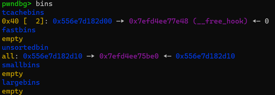 接着我们在申请一个大堆块,将fd改写为__free_hook,key改写成0,那么__free_hook就被加入到了tcache里,最终就可以申请到这里了