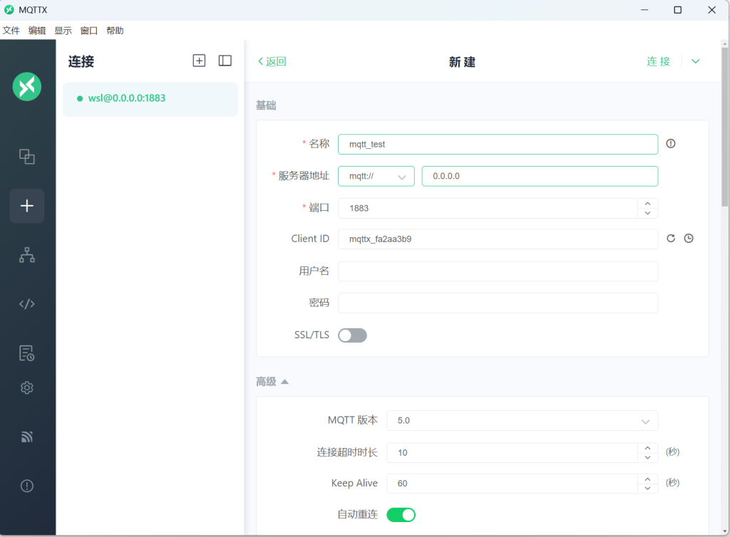 点击新建连接,我这里是wsl启动的,但是监听了所有ip的端口,所以ip直接填0.0.0.0