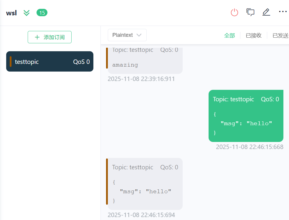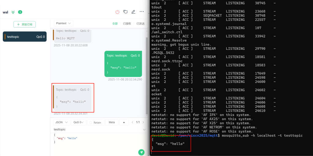 发送之后,在客户端和终端界面均可以看到刚才发的消息
