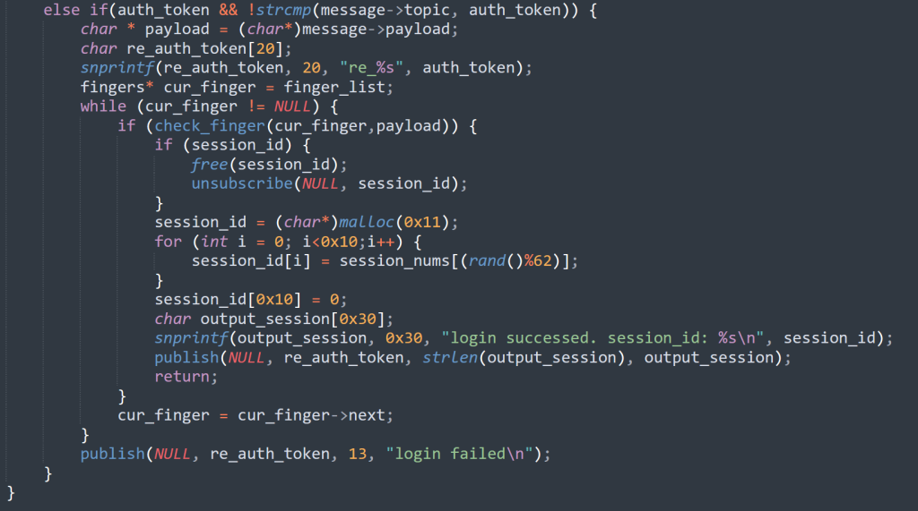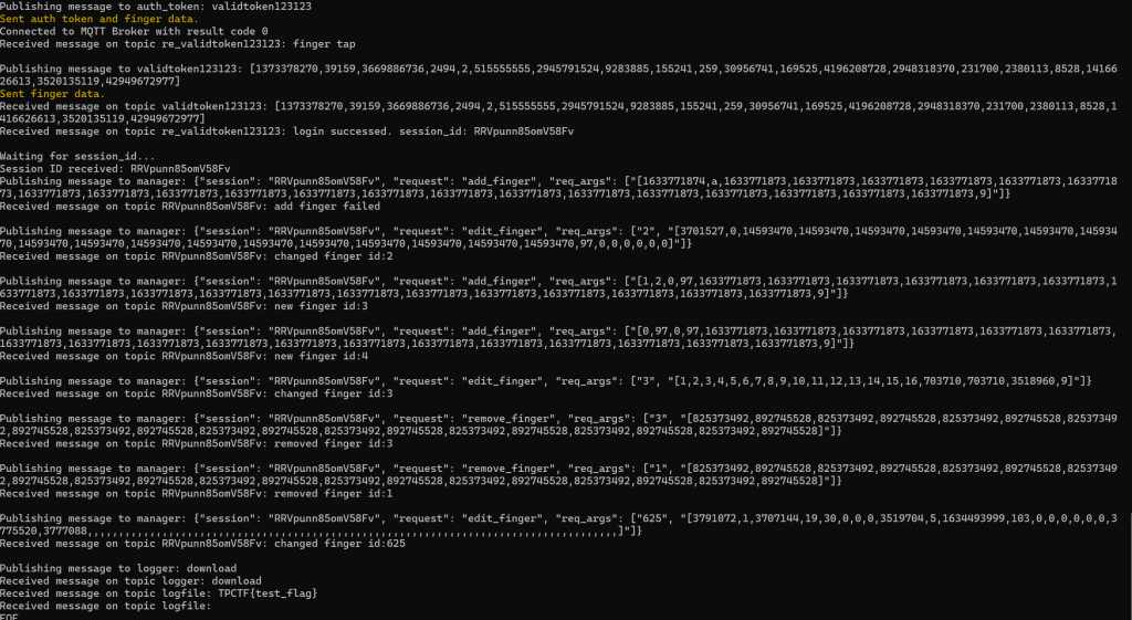 然后就是要发送认证token,发送成功之后,获得一个会话,然后如果指纹验证成功,就可以获得该会话的session_id,而正确的指纹数据就是通过前面的爆破exp获得