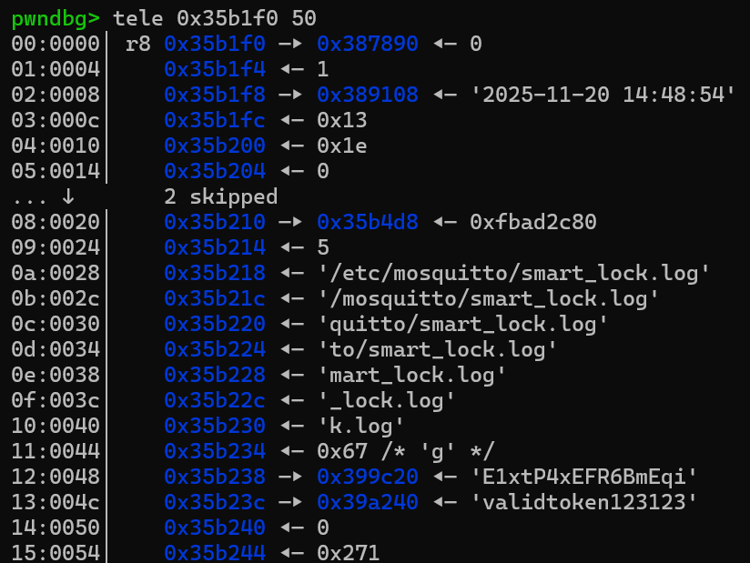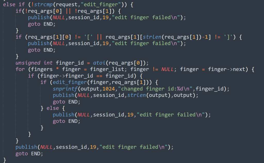 由于log字符串对应的伪造堆块,在finger_id偏移处值为0x271,所以下一次edit要设置finger_id为0x271=625,其余值保持不变即可